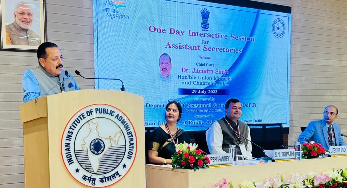 New Delhi, July 29 :While addressing the new IAS officers of 2020 batch undergoing 3-month stint as Assistant Secretaries in the Govt of India, Union Minister of State (Independent Charge) Science & Technology; Minister of State (Independent Charge) Earth Sciences; MoS PMO, Personnel, Public Grievances, Pensions, Atomic Energy and Space, Dr Jitendra Singh today redefined their role for 2047.